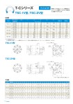7 Tricolour T-Cシリーズ クッション付 TSC-1V型、TSC-2V型 TSC-1V型 TSC-2V型 仕様表 寸法表 注(1)実効値は80%です。 (2)揺動角度の両端にクッション機構を加えたもので、この場合の揺動角度は最大210°です。クッション効果は約10°となります。 型式揺動角度A B C1 C2 D1 D2 E F G H1 H2 K L M O S S1 S2 S3 T W X1 X2 Y1 Y2 d PT PCD TSC- 6 1V-210° 95 108 90 60 16 20 5 13 14 22 17 36 160 52 15 31 25 12 30 43 109 7.5 15 19 23 9 RC 1/4 78 2V- 90° M6 TSC-12 1V-210° 110 120 105 70 18 20 5 15 14 22 17 36 165 52 15 31 25 12 30 43 114 9 18 23 28 9 RC 1/4 92 2V- 90° M6 TSC-20 1V-210° 105 120 100 70 20 20 5 17 14 22 18 40 195 52 15 35 30 12 35 44 140 8 17 22 26 9 RC 1/4 88 2V- 90° M6 TSC-50 1V-210° 140 155 135 85 30 30 7 26 21 24 20 45 225 70 20 40 35 15 40 47 160 12 23 31 36 11 RC 3/8 116 2V- 90° M10 TSC-80 1V-210° 145 165 140 90 35 35 10 30.5 26 24 20 50 250 75 20 45 40 15 45 47 180 12 24 32 38 14 RC 3/8 122 2V- 90° M10 型式 圧力 M Pa 0.5 1 2 3 4 5 容量 . 質量 s 揺動角度トルク N・m TSC- 6 1V-210° 3 6 12 18 24 30 30 5.8 2V- 90° 6 12 24 36 26 5.9 TSC-12 1V-210° 6 12 24 36 48 60 62 7.6 2V- 90° 12 24 48 72 53 7.7 TSC-20 1V-210° 10 20 40 60 80 100 94 8.4 2V- 90° 20 40 80 120 80 8.5 TSC-50 1V-210° 25 50 100 150 200 250 203 17.5 2V- 90° 50 100 200 300 400 500 175 17.7 TSC-80 1V-210° 40 80 160 240 320 400 312 20.8 2V- 90° 80 160 320 480 640 800 270 21.1 ※aポート加圧で矢印方向に揺動します。 PCD G PCD G 4〜φdキリX1 X1 a ポート b ポート 2〜クッション調整ノズル 2〜PT Y2 Y2 A A F φB EN9 4〜φdキリ Y1 X1 a ポート b ポート 2〜クッション調整ノズル 2〜PT Y2 A X2 A F φB EN9 aポート S2 S1 S3 S K O WL T H1 11 5 3 φD2h9 φD1h7 φMh9 φD2 φC1 φC2 aポート b ポート S2 S1 S3 S O W K L 11 T 10 5 3 φD2h9 φD1h7 φMh9 φD2 φC1 φC2 H2 標準タイプTS型にクッション機構を加え たシリーズで、配管ポートをフランジ側に設 け、配管がすっきりします。 | |