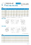 Tricolour 8 T-Cシリーズ クッション付 TRC-1V型、TRC-2V型 TRC-1V型 TRC-2V型 仕様表 寸法表 注(1)実効値は80%です。 (2)揺動角度の両端にクッション機構を加えたもので、この場合の揺動角度は最大210°です。クッション効果は約10°となります。 形式揺動角度A B C1 C2 C3 D1 D2 E F G H K L M O R S S1 S2 S3 T W d PT PCD TRC- 6 1V-210° 125 108 90 92 67 16 20 5 13 14 37 36 175 52 15 25 31 25 12 30 18 124 9 RC 1/4 78 2V- 90° M6 TRC-12 1V-210° 138 120 105 106 80 18 20 5 15 14 37 36 180 52 15 28 31 25 12 30 18 129 9 RC 1/4 92 2V- 90° M6 TRC-20 1V-210° 138 120 100 102 75 20 20 5 17 14 38 40 210 52 15 26 35 30 12 35 18 155 9 RC 1/4 88 2V- 90° M6 TRC-50 1V-210° 175 155 135 140 95 30 30 7 26 21 40 45 240 70 20 36 40 35 15 40 20 175 11 RC 3/8 116 2V- 90° M10 TRC-80 1V-210° 190 165 140 145 100 35 35 10 30.5 26 40 50 265 75 20 38 45 40 15 45 20 195 14 RC 3/8 122 2V- 90° M10 型式 圧力 M Pa 0.5 1 2 3 4 5 容量 . 質量 s 揺動角度トルク TRC- 6 1V-210° 3 6 12 18 24 30 30 6.4 2V- 90° 6 12 24 36 26 6.5 TRC-12 1V-210° 6 12 24 36 48 60 62 8.6 2V- 90° 12 24 48 72 53 8.7 TRC-20 1V-210° 10 20 40 60 80 100 94 9.3 2V- 90° 20 40 80 120 80 9.4 TRC-50 1V-210° 25 50 100 150 20 25 203 18.6 2V- 90° 50 100 200 300 40 500 175 18.8 TRC-80 1V-210° 40 80 160 240 320 400 312 22.2 2V- 90° 80 160 320 480 640 800 270 22.6 ※aポート加圧で矢印方向に揺動します。 PCD G R 2〜クッション調整ノズル PCD G R 2〜クッション調整ノズル b ポート F φB 4〜φd1キリ 2〜PT a ポート15° 15° EN9 b ポート F φB 2〜PT 4〜φdキリaポート 15° 15° 35° EN9 aポート S2 bポート S1 S3 S O W K H L T 5 3 φD2h9 φD1h7 φD2 φMh9 φA φC2 φC3 φC1 aポート b ポート S2 S1 S3 S O W K H L T 5 3 φD2h9 φD1h7 φD2 φMh9 φA φC2 φC3 φC1 標準タイプTR型にクッション機構を加え たシリーズで、配管ポートが後部に設けて あるため、うめ込まれた場所等での使用が 可能です。 | |